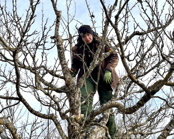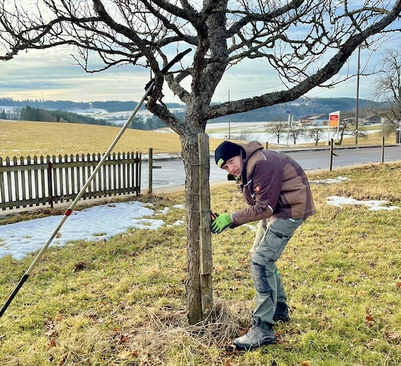 Bei Jäger – Leben im Garten werden die Lehrlinge regelmäßig von unserem Pflanzengestalter Daniel Müller im Baumschnitt geschult, sowohl praktisch in der Streuobstwiese als auch theoretisch. Sie lernen über den Aufbau der Bäume, die Wachstumsregeln, Schnittarten und erfahren, wie Fruchtholz gefördert oder Fehlentwicklungen vermieden werden. Wie man auf den Bildern sieht, geht es für einige recht hoch hinaus. Ein bisschen Mut gehört zum Bäumeschneiden neben dem Fachwissen eben auch dazu.