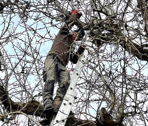 Bei Jäger – Leben im Garten werden die Lehrlinge regelmäßig von unserem Pflanzengestalter Daniel Müller im Baumschnitt geschult, sowohl praktisch in der Streuobstwiese als auch theoretisch. Sie lernen über den Aufbau der Bäume, die Wachstumsregeln, Schnittarten und erfahren, wie Fruchtholz gefördert oder Fehlentwicklungen vermieden werden. Wie man auf den Bildern sieht, geht es für einige recht hoch hinaus. Ein bisschen Mut gehört zum Bäumeschneiden neben dem Fachwissen eben auch dazu.